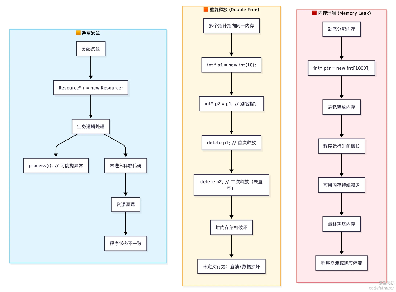 传统指针可能会导致内存泄漏、重复释放和一场安全问题,进而导致程序奔溃: